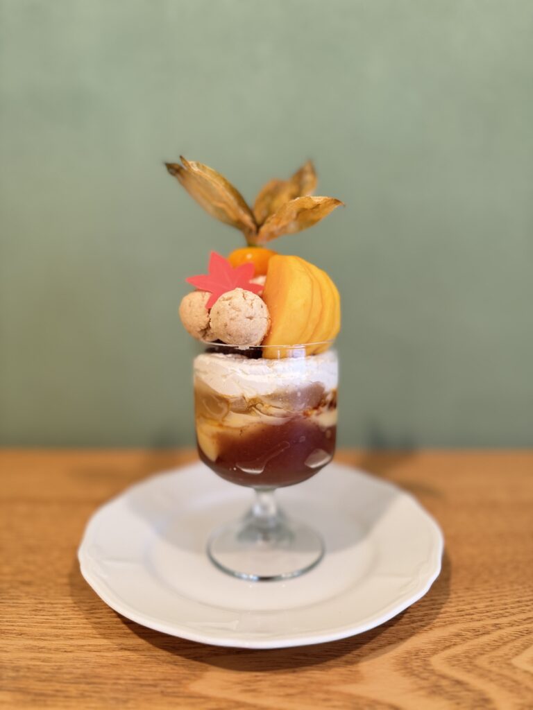 器の中に夕陽が眩しい秋を感じ、色んな秋が味わえるパフェとなってます。